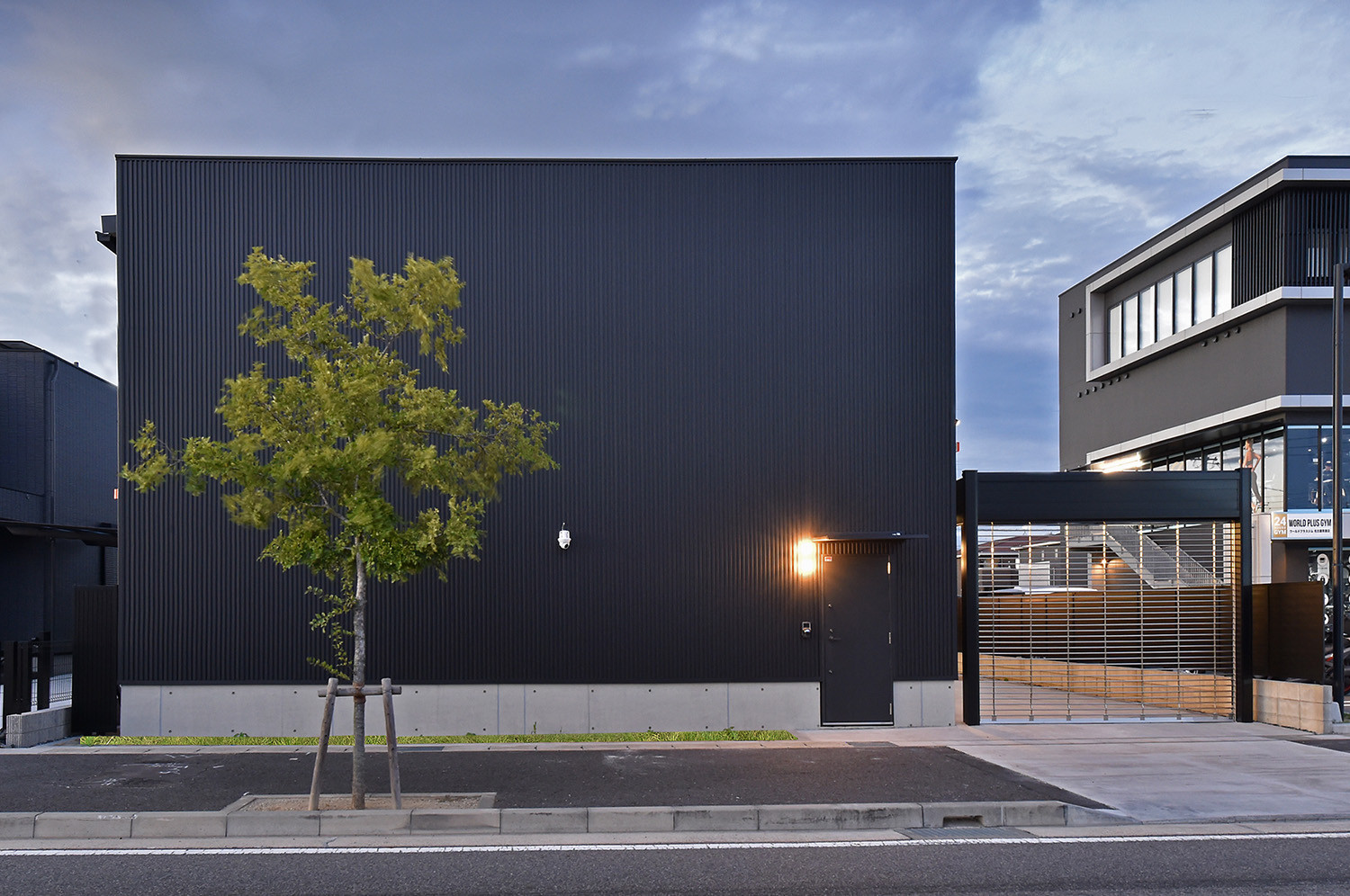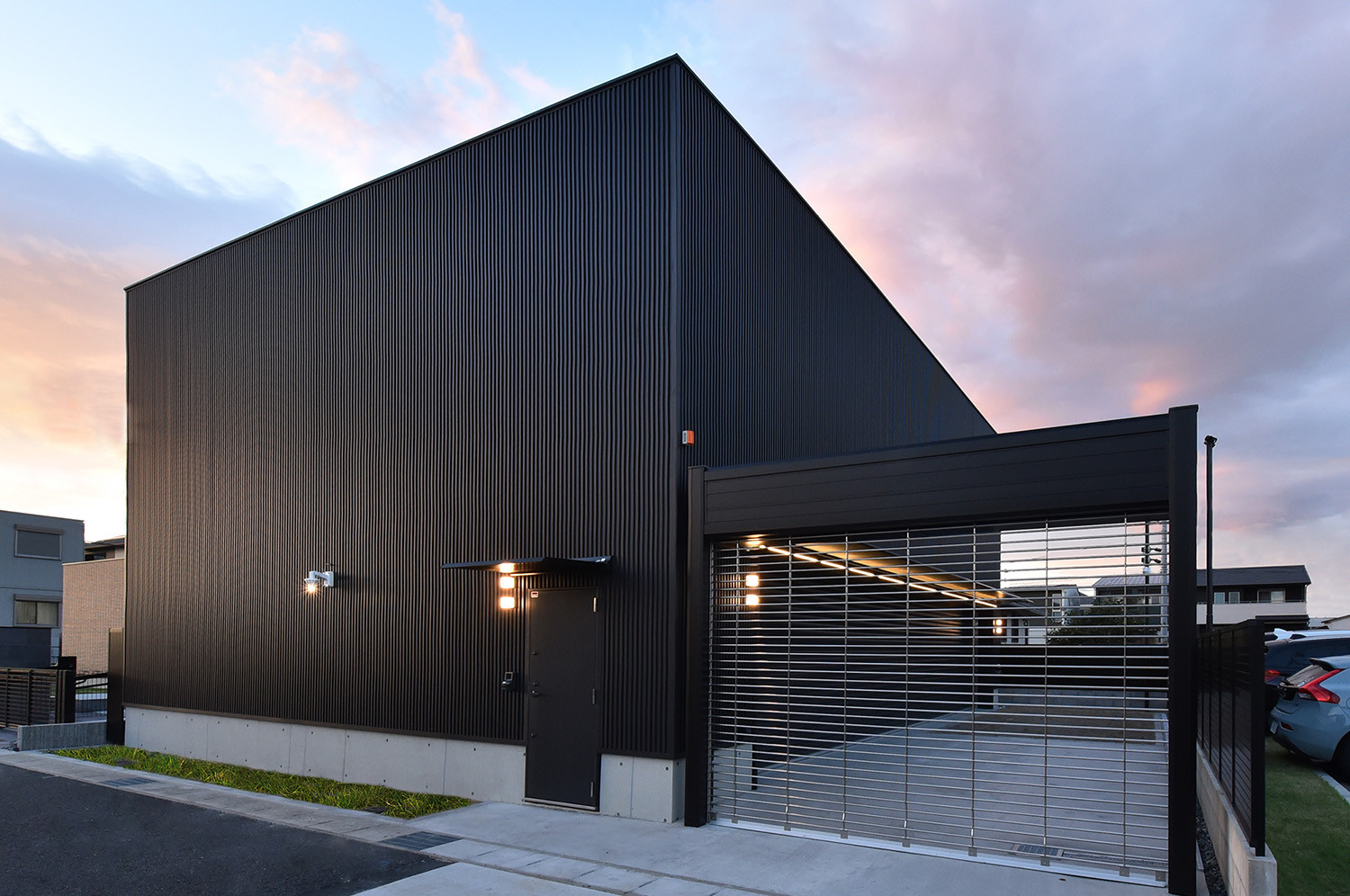 12メートルの開口がつくる、黒い箱のガレージ