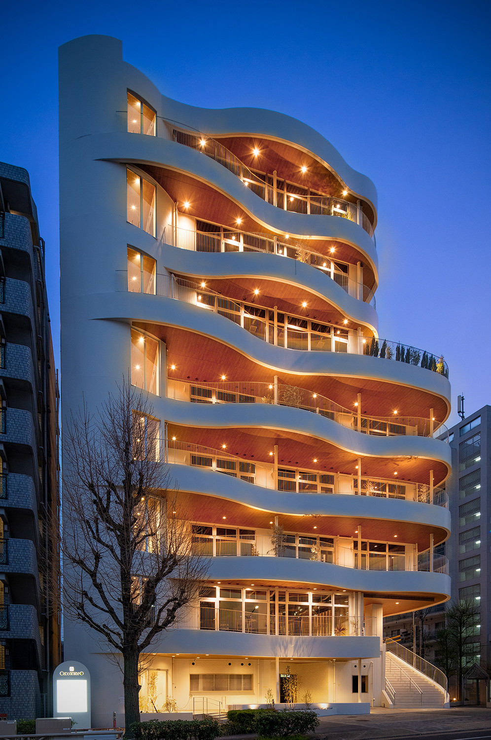 「大人の美」を追求したテナントビル。 美容、医療、食、健康。 都市に点在する「整う」を、ひとつの建築に重ねることからcoco totonoは生まれた。 感性に寄り添う、柔らかな曲線と植栽のファサード。 街に開かれた、癒しの拠点。