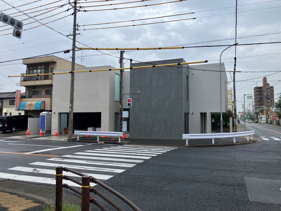 コンクリート造2階建ての外壁に1200mm×600mmという2色の大判タイルをそれぞれ縦貼り・横貼りに別け施工しました。
